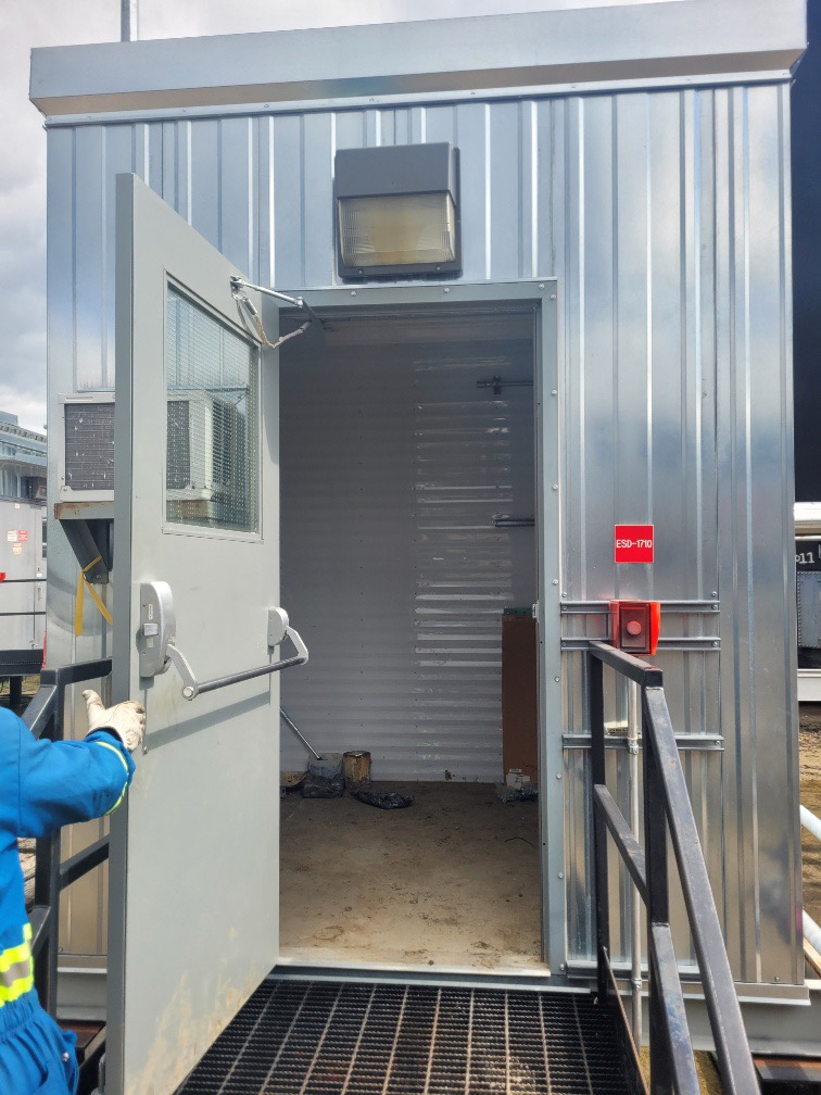 This skid measures/gives a water cut of any trucked in emulsion to the battery.